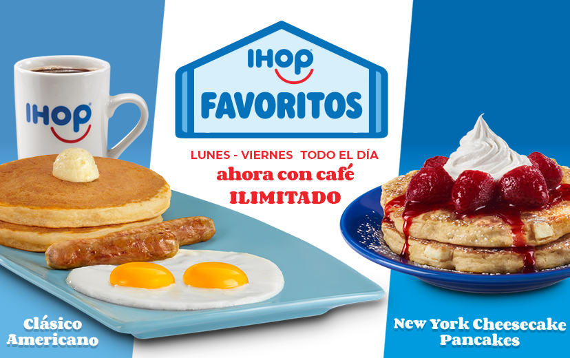 Promoción válida en restaurantes IHOP participantes, de lunes a viernes, del 12 de enero al 16 de agosto de 2026 o hasta agotar existencias. No aplica con otras promociones y/o descuentos. Todos nuestros precios incluyen IVA. Promoción no válida en días festivos. Los platillos de $109 pesos que incluyen café refill son: los Pancakes de sabor, el Clásico Americano y Huevos Rancheros con Pan. Los de $129 pesos que incluyen café refill son: el House Scramble, Ham & Cheese Omelette y los Waffle & Eggs. Los platillos de $159 pesos que incluyen Refresco de refill son: el Chicken Sandwich, Chicken & Pancakes y la Pasta Marinara. Régimen de excepción para entrega a domicilio, ya que pueden aplicar cargos extras. IHOP no puede asegurar que las opciones de su menú no contengan ingredientes que pueden causar una reacción alérgica o tener un impacto negativo en otras restricciones de dieta. Puede solicitar más información sobre los alérgenos en restaurante. Las imágenes son sólo de carácter ilustrativo. ©2026 IHOP Restaurants LLC.