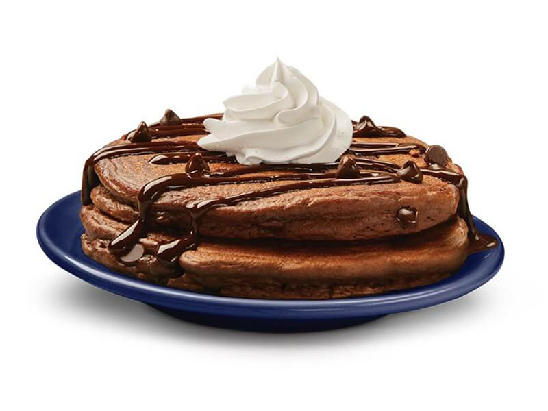 Dos esponjosos Pancakes de chocolate, rellenos de chispas de chocolate, cubiertos con salsa de chocolate, más chispas de chocolate y crema batida.*Combo.