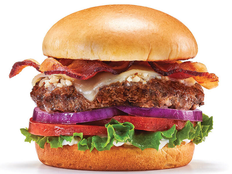 Hamburguesa de res (180 g) , mantequilla de ajo, queso Cheddar blanco, tocino ahumado, lechuga, tomate y mayonesa.