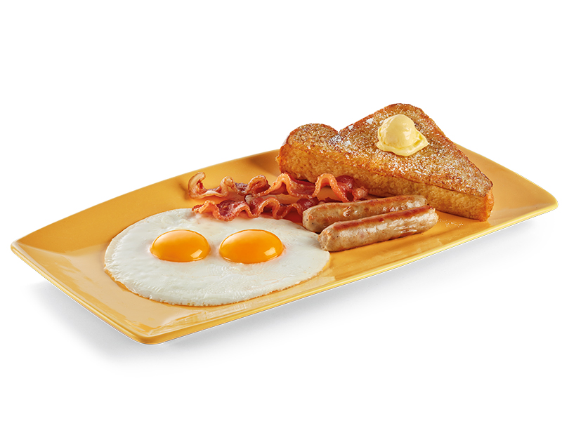 Dos triángulos de pan francés y dos Buttermilk Pancakes servidos con una sustanciosa combinación de dos huevos, dos tiras de tocino crujiente y dos salchichas.