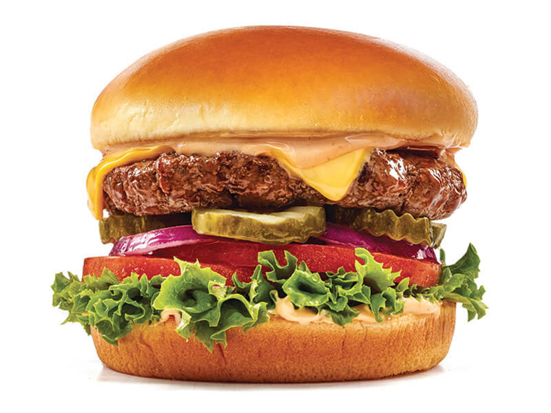 Realmente una hamburguesa clásica de res (180 g) con queso Americano, lechuga, tomate, cebolla morada, pepinillos y nuestra salsa de la casa IHOP®. Disponible con tocino.